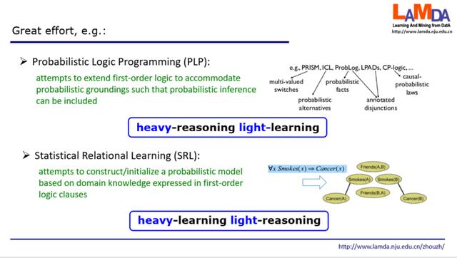 所以我们可以看上面这两大类做法。第一类,我们可以看到它是把机器学习往逻辑推理中引,但是后面主体还是通过推理来解决问题,所以我们称它是推理重而学习轻。第二种做法基本上是反过来,它把逻辑推理的技术往机器学习里面引,但是后期主要的解决问题是靠机器学习,所以我们称它是学习重而推理轻。总是一头重一头轻,这就意味着有一头的技术没有充分发挥威力。