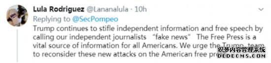 也不乏网友表示,蓬佩奥关于美国媒体的描述似乎与总统特朗普不太一致。一位网友称,“特朗普将我们独立记者(报道的内容)称为‘假新闻’,不断‘扼杀’独立信息和言论自由……我们敦促特朗普团队重新考虑这些对美国新闻自由的新攻击。”